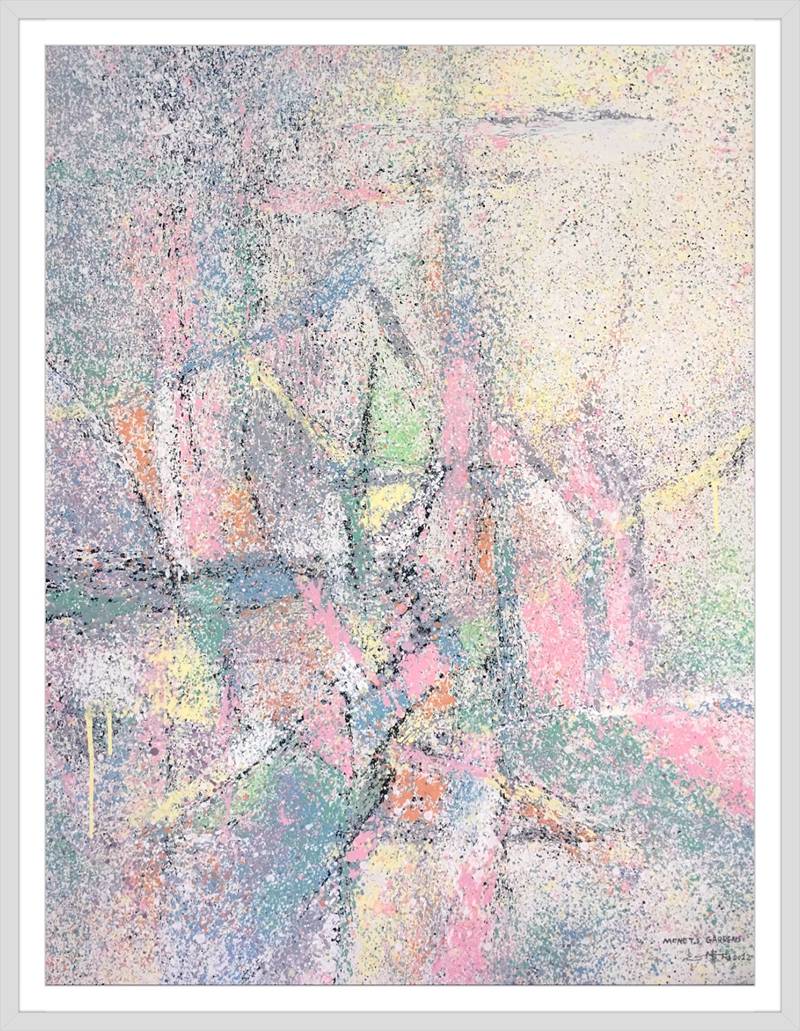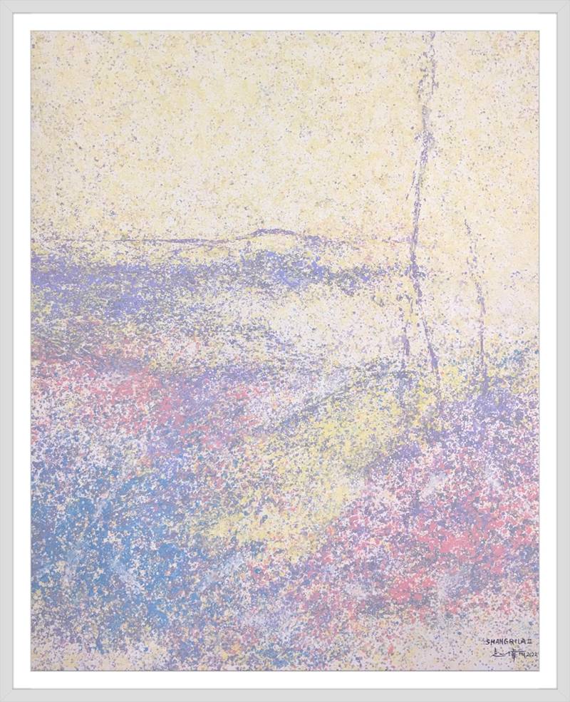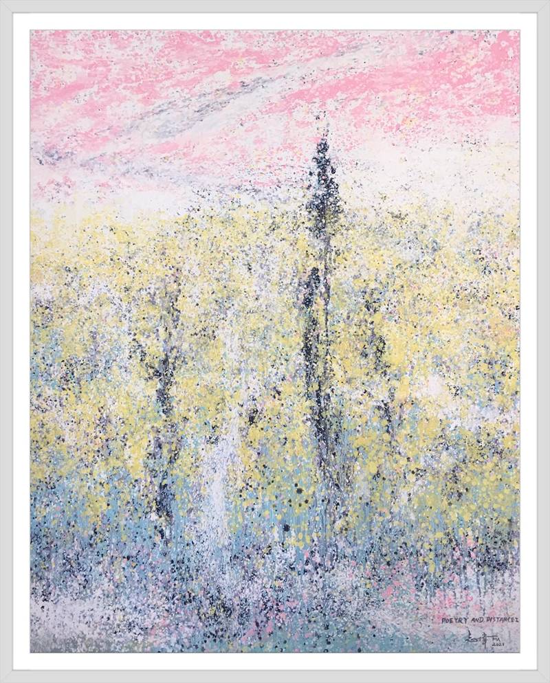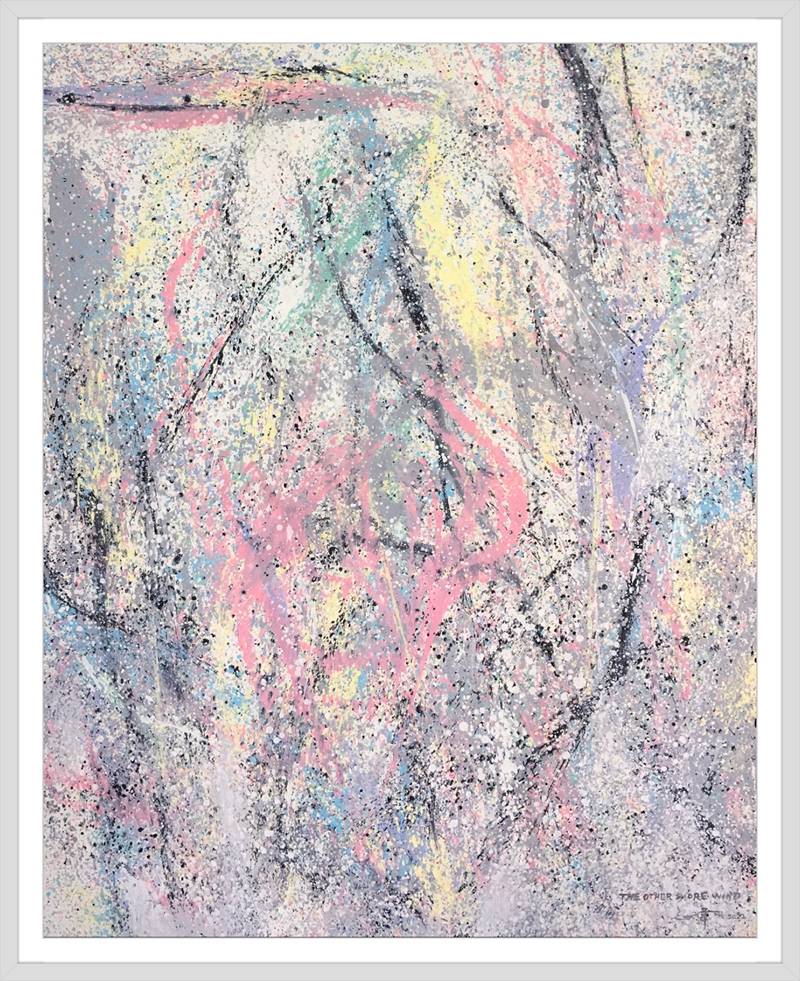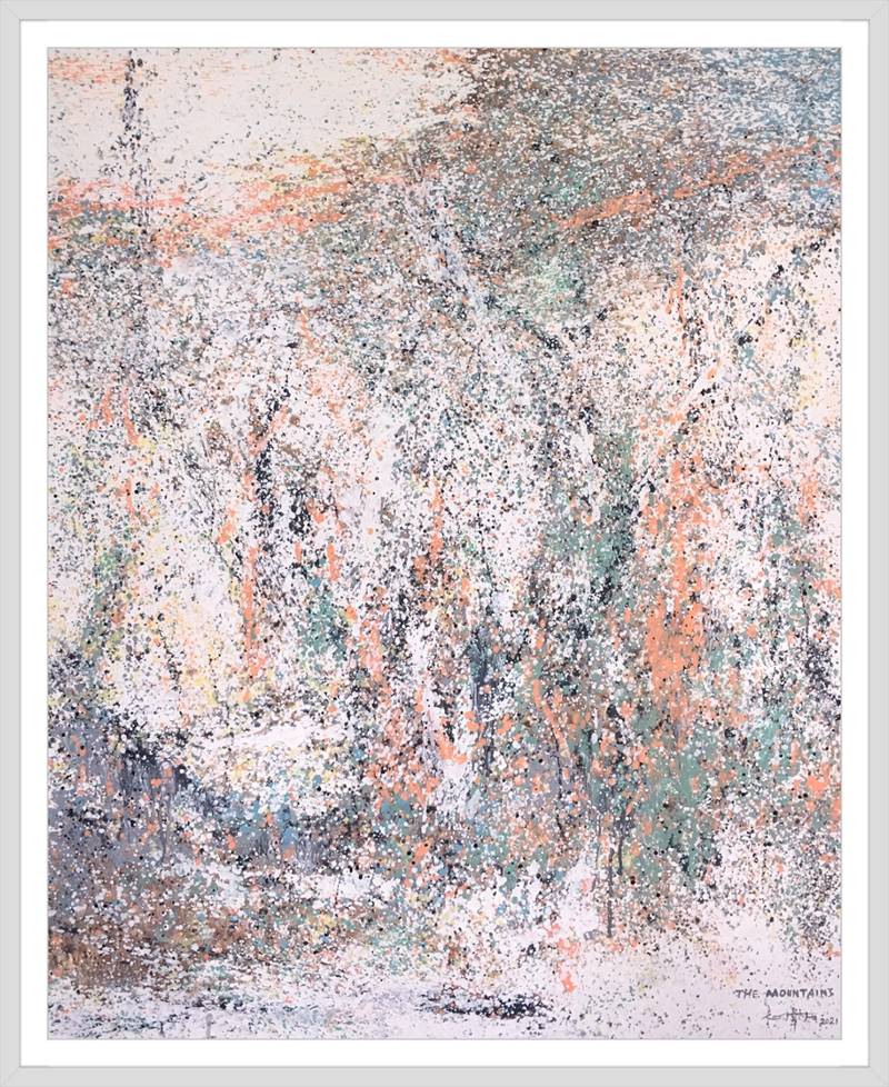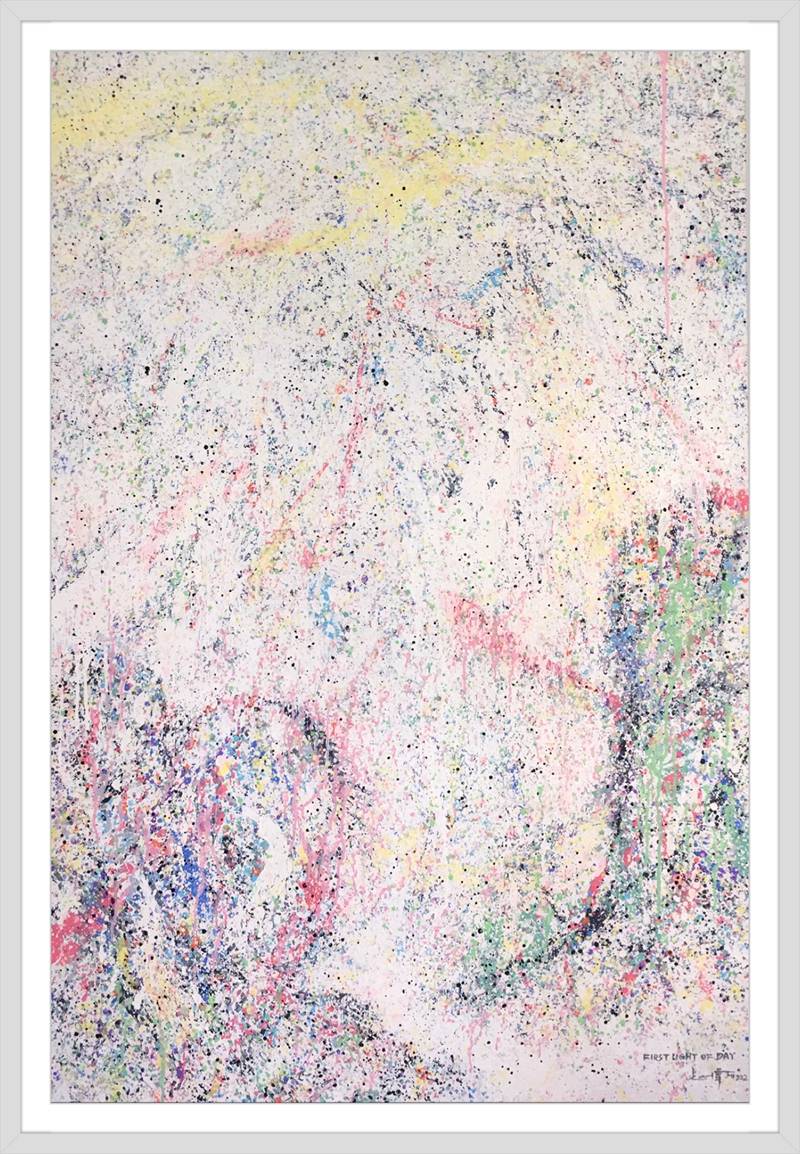 灑成的色彩微點,通過疏密佈置,高低相盈,前後相隨,有無相生等等豐富多元的結構組織,為審美帶來無窮無盡的哲學思維通道。站在這個角度講,傅志偉的灑彩作品是構建在中國傳統文化體系內的抽象創作結果,印象派的色彩,中國畫的意境,是詩意化了的抽象美術創作結果。精微細膩,惟妙惟肖。這與波洛克的滴彩創作,可以視之為當代抽象創作來自東方和西方的和壁與隋珠,他們共同拱鼎起現代抽象美術的世界天空!