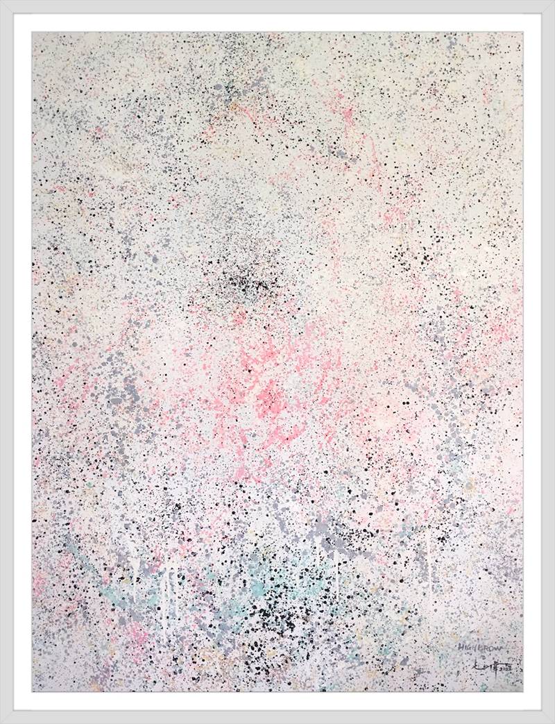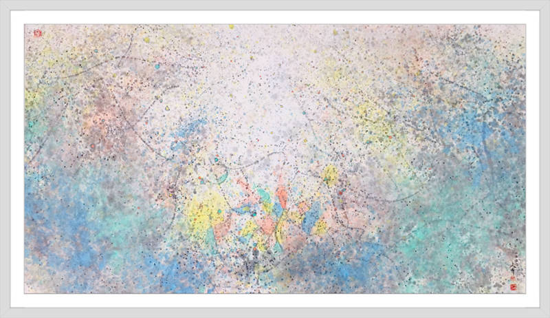 但是從畫面的美術屬性上來看,傅志偉的純灑彩與波洛克的滴彩又有明顯的差別。在線條的運用上,波洛克實施的是“強化”路徑,畫面隨時可以凸顯線條的交錯,直觀效果明顯。傅志偉的純灑彩作品對線條卻是實施“弱化”的反向路徑,點的存在作為主體,線條存在作出虛化,這種畫面效果更加符合東方審美“寥兮無若止,湛兮似或存”的空間觀,以成全“視而不見曰為夷,搏而不得曰為微,聽而不聞曰為稀”的抽象效果。這事實上是中國式的抽象方式,或者稱之為“意象”的詩化,這是從中國畫裏轉接過來的抽象語言。