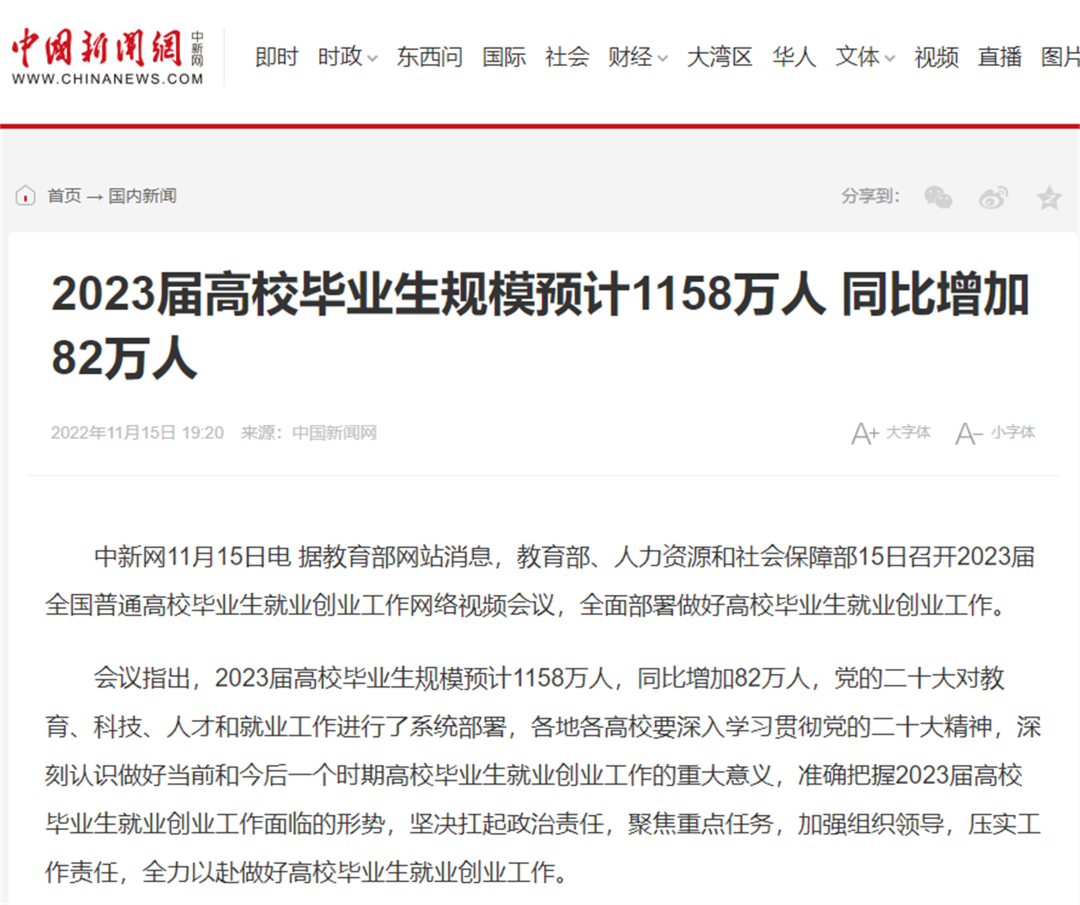 2021年,我國大學畢業生人數為909萬,2022年為1076萬,今年這個數字飆升到1158萬。