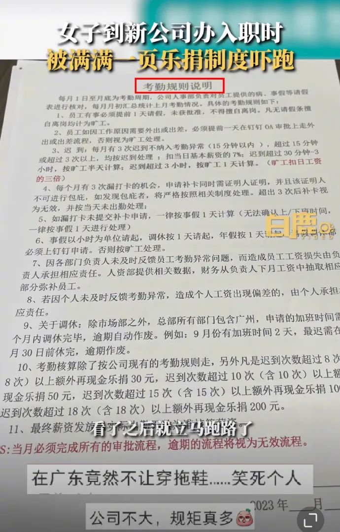 她在家公司面試後,當即被錄用。隨後辦理入職的時候,公司發了整整一頁的“樂捐”制度。