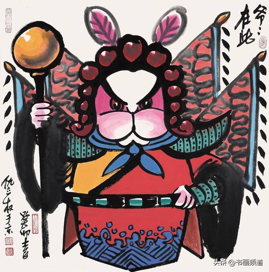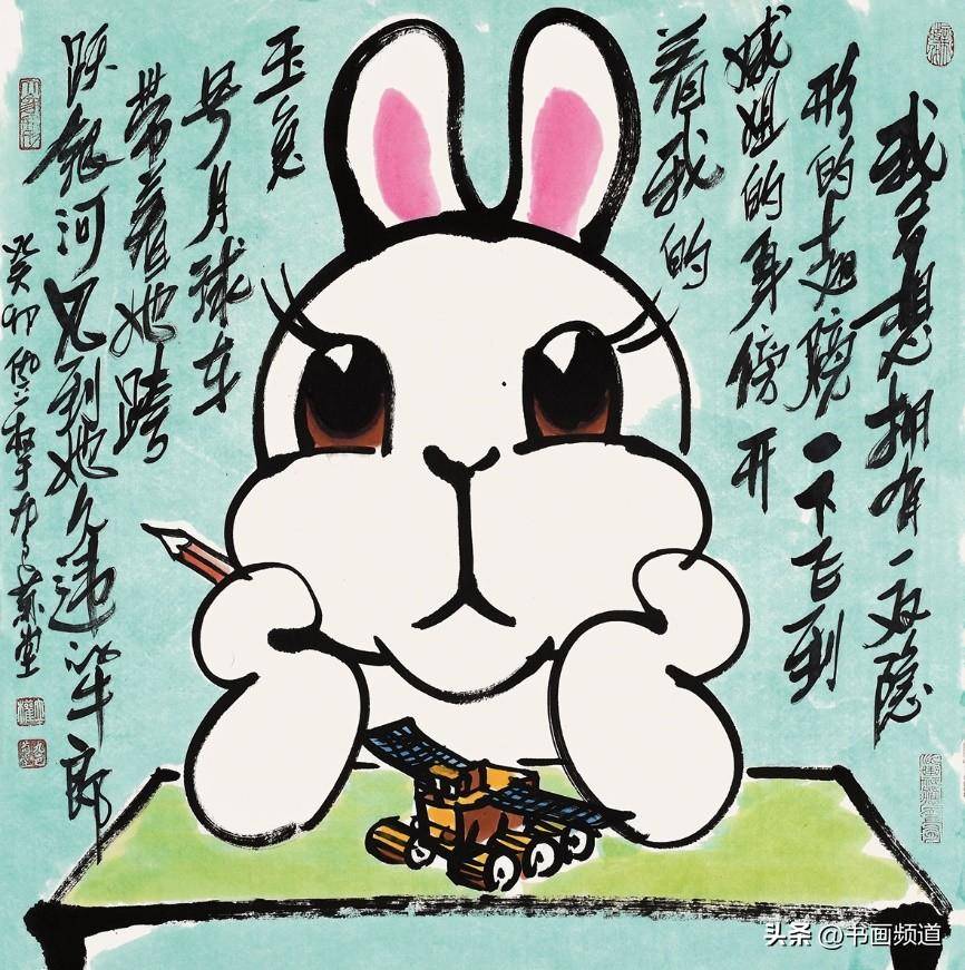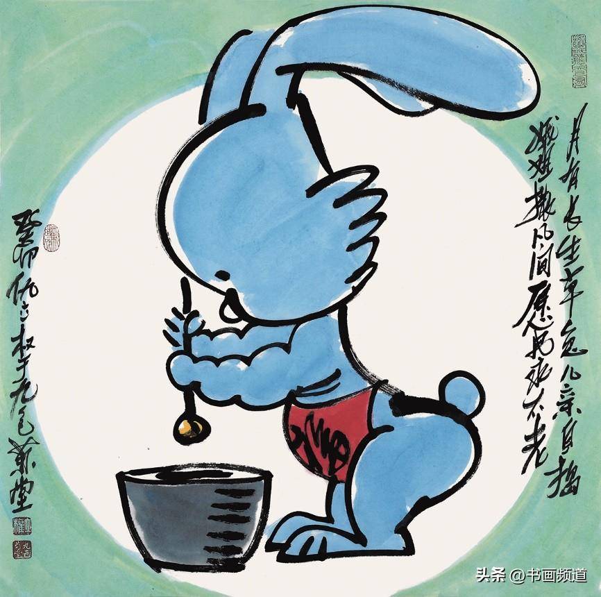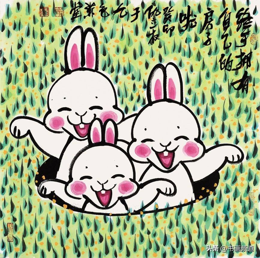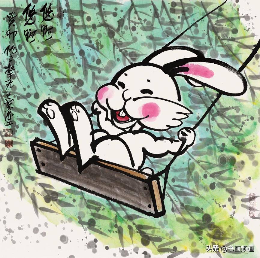 仇立權一向善於抓住一個專題,確立具體的敍事、形象、物像、結構、主流、方向,積極吸取中國文化傳統的豐富思想,由此再結合當下發展趨勢的尋找突破口、切入點,結合自己現實中搜集的藝術料庫一再篩選合適的繪畫表現圖式,然後以自己獨特的毛筆筆觸、繪畫語言、語序語調去塑造自己心目中的藝術形象,提煉出符合新時代的藝術靈魂,就這樣完成了仇立權一個個藝術專題創作,筆意墩厚,繞樑不絕。仇立權的十二生肖畫展每年都搞,已經成為他的一個固定的年度系列作品。2023年是癸卯兔年,所以他就專門創作了一批兔子,其中有年畫類偏向中國傳統吉祥文化的,表達一種富裕喜慶、美好願望、神獸神力的福到了、兔爺民俗文化,這都是大家喜聞樂見的,可以稱為近年新興的一種新民俗、新年畫,如《玉兔迎春到》《赤兔是神獸》《金龜玉兔》《安能辯我是雌雄》,讓古意有了新意,也讓傳統水墨煥然新面貌。今年的兔年畫展中,有一批仇立權專為小朋友創作的作品,它們像兒童娛樂、教育、漫畫的四不像即興創作,但又是天才的創作,因為它們任由藝術家發揮,卻跳出了所謂的條條框框,正因為如此卻越發的為人喜歡、稱道,如《終於有了自己的房了》《悠啊悠啊》《小心大灰狼》《你吃了我的窩邊草》《我一出拳》《哥,你説月亮上沒有一根草》《這棵樹永遠不會倒》等,都描述了生活快樂的瞬間,不管大人還是小孩,看了都會開心一笑,充分展現了仇立權藝術語言的獨特魅力。
