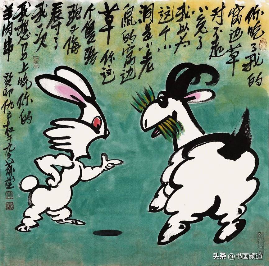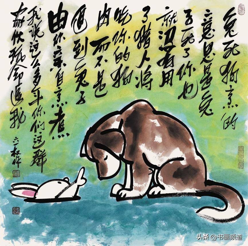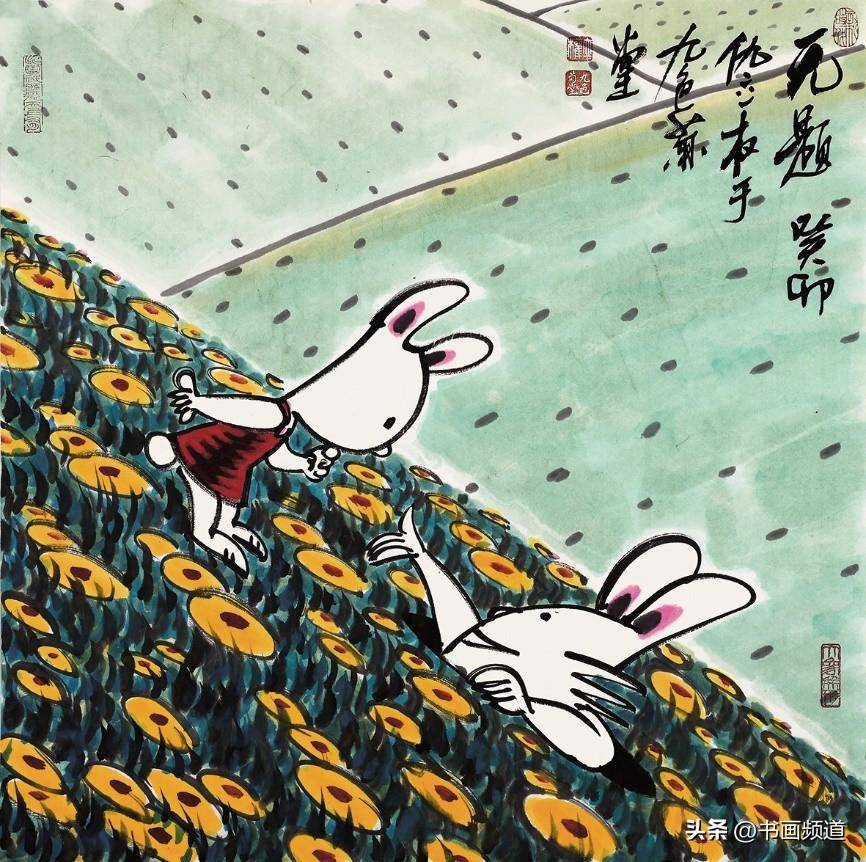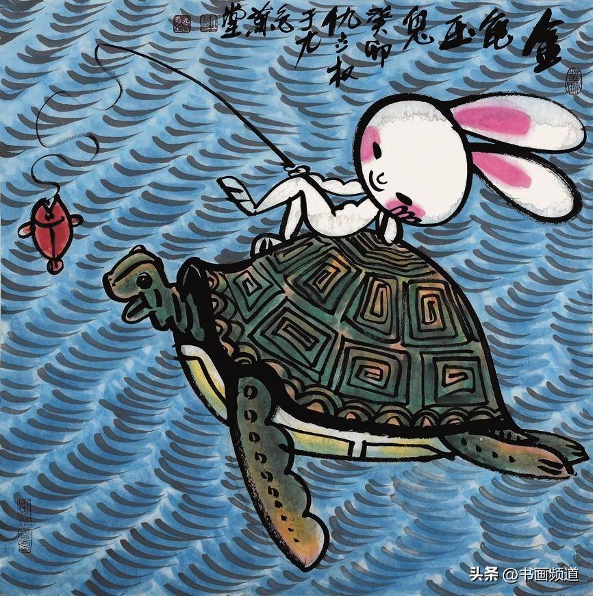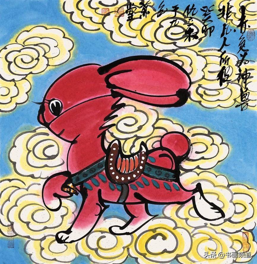 仇立權一向善於抓住一個專題,確立具體的敍事、形象、物像、結構、主流、方向,積極吸取中國文化傳統的豐富思想,由此再結合當下發展趨勢的尋找突破口、切入點,結合自己現實中搜集的藝術料庫一再篩選合適的繪畫表現圖式,然後以自己獨特的毛筆筆觸、繪畫語言、語序語調去塑造自己心目中的藝術形象,提煉出符合新時代的藝術靈魂,就這樣完成了仇立權一個個藝術專題創作,筆意墩厚,繞樑不絕。仇立權的十二生肖畫展每年都搞,已經成為他的一個固定的年度系列作品。2023年是癸卯兔年,所以他就專門創作了一批兔子,其中有年畫類偏向中國傳統吉祥文化的,表達一種富裕喜慶、美好願望、神獸神力的福到了、兔爺民俗文化,這都是大家喜聞樂見的,可以稱為近年新興的一種新民俗、新年畫,如《玉兔迎春到》《赤兔是神獸》《金龜玉兔》《安能辯我是雌雄》,讓古意有了新意,也讓傳統水墨煥然新面貌。今年的兔年畫展中,有一批仇立權專為小朋友創作的作品,它們像兒童娛樂、教育、漫畫的四不像即興創作,但又是天才的創作,因為它們任由藝術家發揮,卻跳出了所謂的條條框框,正因為如此卻越發的為人喜歡、稱道,如《終於有了自己的房了》《悠啊悠啊》《小心大灰狼》《你吃了我的窩邊草》《我一出拳》《哥,你説月亮上沒有一根草》《這棵樹永遠不會倒》等,都描述了生活快樂的瞬間,不管大人還是小孩,看了都會開心一笑,充分展現了仇立權藝術語言的獨特魅力。
