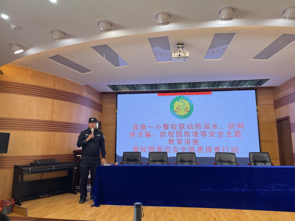 學校安全無小事,責任重於泰山。為了更有效地築牢安全防線,消除校園內外安全隱患,更進一步加強全校師生防範意識,切實保護全體師生安全。2023年4月7日下午,南昌縣公安局蓮塘鎮派出所民警受邀來到蓮塘第一小學學術報告廳,為同學們做一場了防溺水、防網絡詐騙、防校園欺凌等安全專題教育講座,並對該校園周邊環境進行了安全隱患評估排查,以實際行動促進了警校聯動,為校園安全保駕護航。