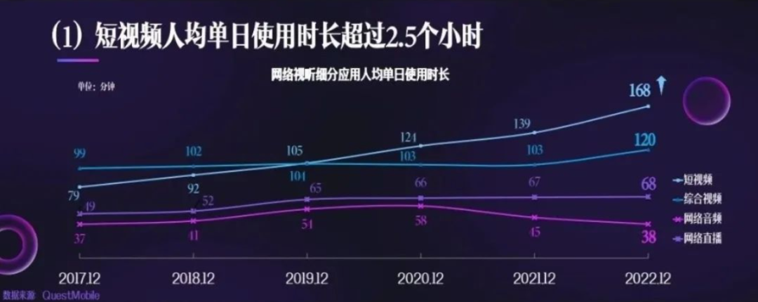 據中國網絡視聽節目服務協會2023年3月發佈的《中國網絡視聽發展研究報告(2023)》顯示,短視頻應用的人均單日使用時長超過2.5個小時,而綜合視頻應用的人均單日使用時長僅為120分鐘,二者差距也在逐年拉大。