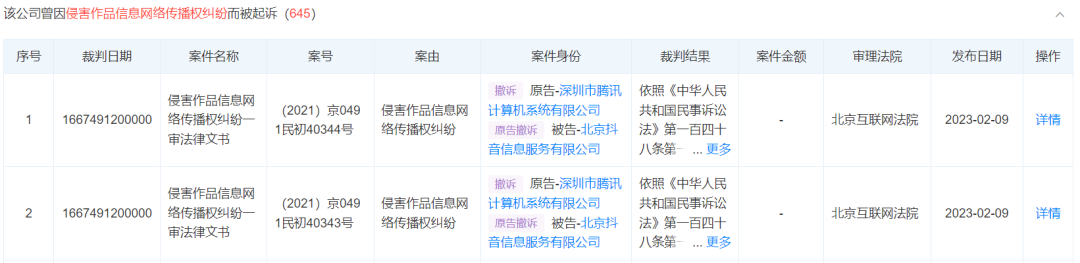 其中,抖音和騰訊也曾因“版權糾紛”而多次對簿公堂。字節跳動起訴過騰訊,騰訊也起訴過抖音。儘管從數量上來看,騰訊視頻起訴的數量更多,索賠金額也更大,但並不影響雙方以“版權保護”為武器,向對方發出“侵害作品信息網絡傳播權糾紛”的攻擊。