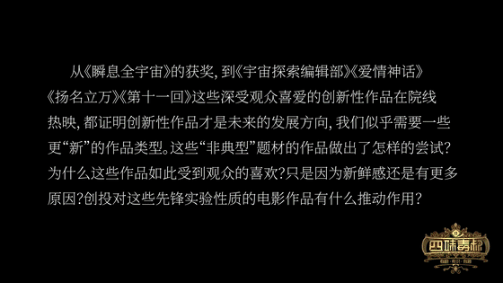 大家好,歡迎來到《四味毒叔》,我是中央戲劇學院教師倪駿,也是一個編劇。從《瞬息全宇宙》“橫掃奧斯卡”拿下多個獎項,到《宇宙探索編輯部》《愛情神話》《揚名立萬》《第十一回》這些深受觀眾喜愛的創新性作品在院線熱映,都證明創新性作品才是未來的發展方向,我們似乎需要一些更“新”的作品類型。這期節目我們就來聊聊這些“非典型”題材的作品做出了怎樣的嘗試,這些作品受到觀眾的喜歡到底有哪些原因,以及創投對這些先鋒實驗性質的電影作品有什麼推動作用。
