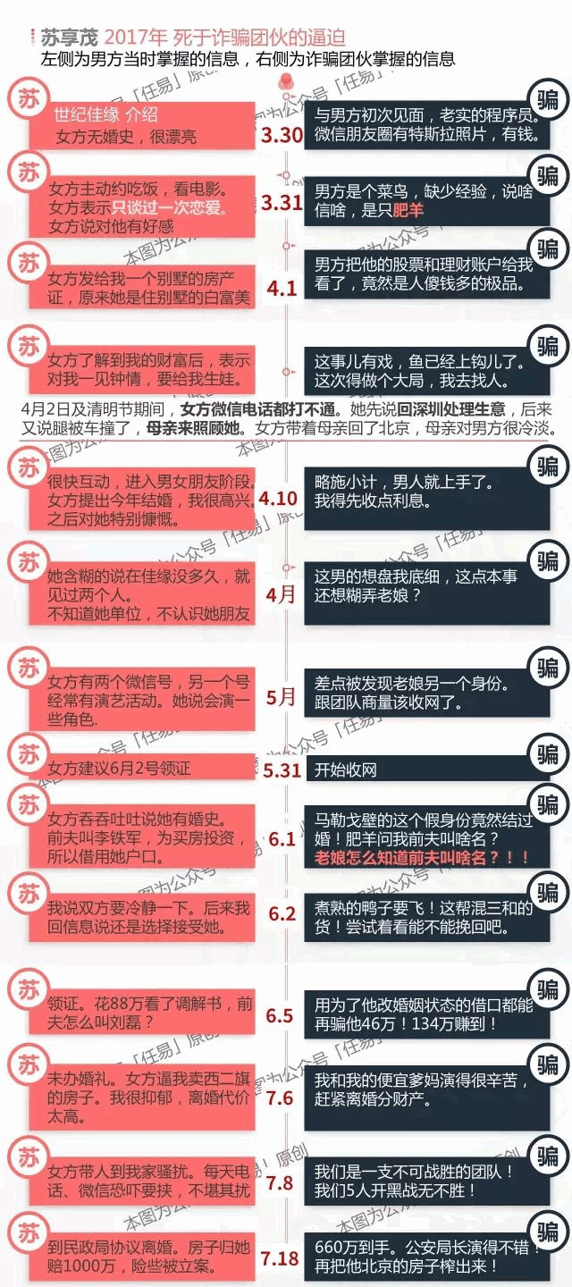 2017年剛剛事發的時候,我寫了這篇《老實人就活該被壞人欺負死?|蘇享茂被前妻逼死》,現在瞭解了細節,加上法院的判決,我更加確認了這一點:女方身後,是個詐騙團伙。除此之外,沒有辦法解釋,一個正常女人竟會殺雞取卵的壓榨如此順從、富有且慷慨的丈夫,殺掉會下金蛋的雞!