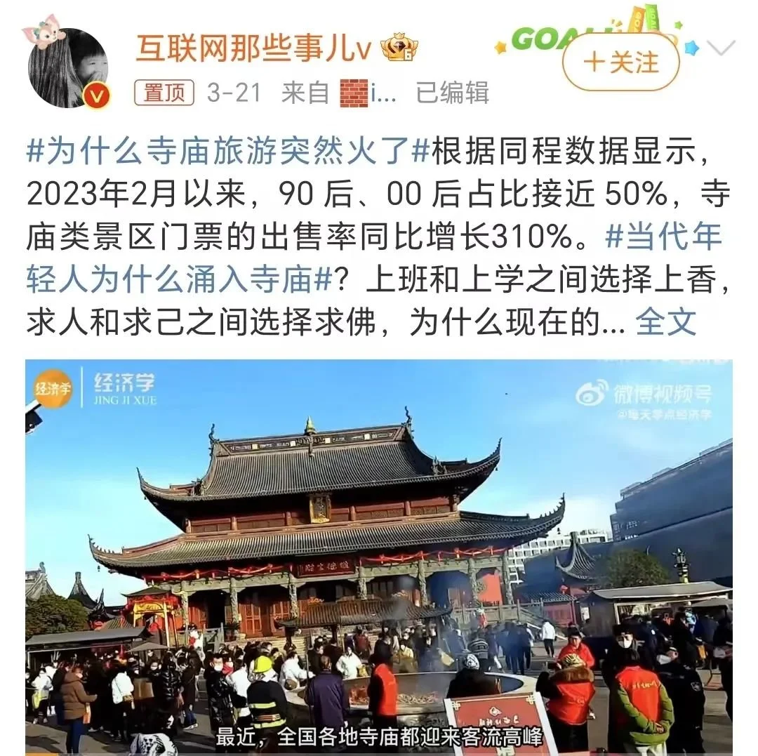 引發熱議的點是,寺廟被年輕羣體擠爆。同程數據顯示,今年以來,寺廟相關景區門票訂單量同比增長 310%;2 月以來預訂門票的人羣中,90 後、00 後佔比接近 50% 。