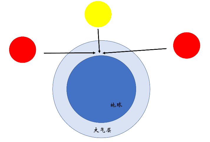 無論是旭日東昇還是夕陽西下,陽光穿過大氣層的距離較長,藍紫光會被充分散射掉,因此紅光會被格外突出地顯示出來。在中午時,陽光基本垂直照射,穿過的大氣層距離較短,散射不充分,因此呈現黃白色。