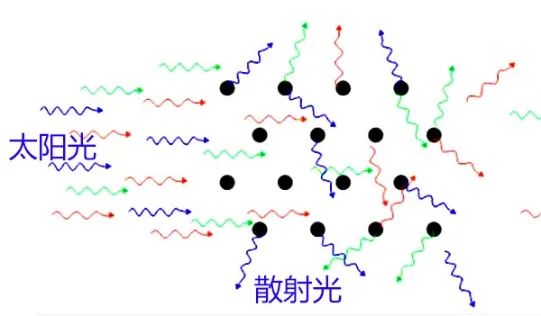 瑞利散射的特徵是,強度與光的頻率f的四次方成正比,這意味着頻率高的藍紫光的散射會顯著高於頻率低的紅光。陽光穿過大氣層時,會發生瑞利散射,頻率較低的紅光會基本沿直線傳播,而頻率較高的藍紫光會被散射向四面八方。我們看向天空相當於並不直視太陽,因此看到的會是被散射的部分,應為藍紫光。又由於紫光易被大氣吸收,很難到達人眼,這就解釋了為何天空是藍色。