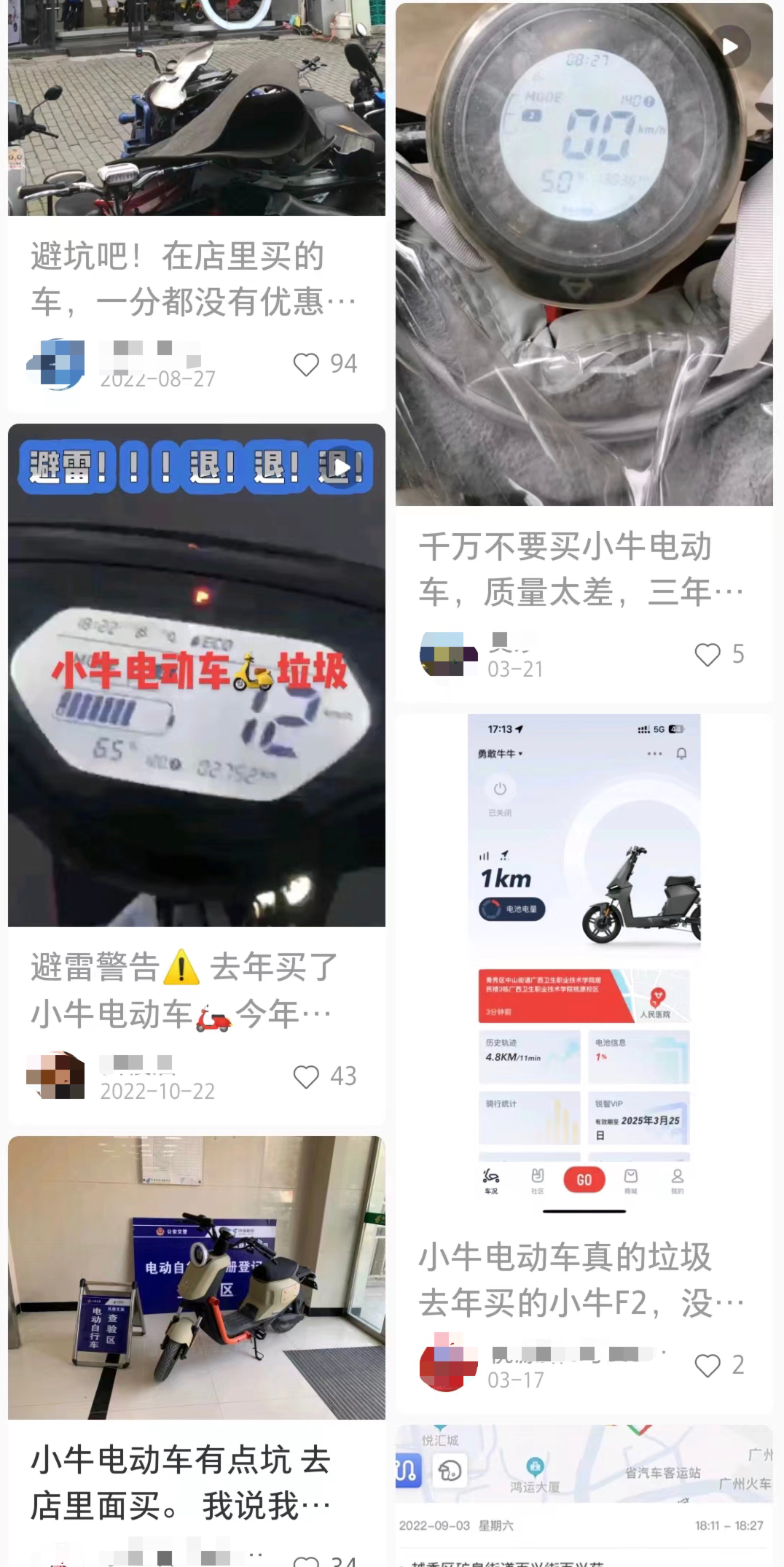 「探客出行」還注意到,小牛電動也陷入了口碑信譽下滑的尷尬境地。無論是在抖音、小紅書等社交平台,還是在天貓、京東等電商平台,抑或是在黑貓投訴等投訴平台上,都能看到關於小牛電動產品質量問題的投訴。