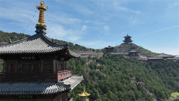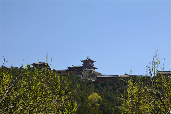 一年四季,太山景色各不相同,特點各異。冬日裏,枯黃的樹葉掉落,但山上的松柏愈顯倉幽。冬風拂過,隱約傳來悦耳的風鈴聲,清脆、純淨,盪滌了一切紛擾和雜念。松柏掩映之中,隱現着由牌樓、山門、戲台、中門、鐘鼓樓、三大士殿、佛祖閣、廂房、禪房、觀音堂、文殊殿、普賢殿構成的宏大寺院羣。整個寺廟依山而建,高低參差,錯落有致。拾級而上,木雕指路牌清晰瞭然,殿堂樓閣,小巧玲瓏,自成格局。