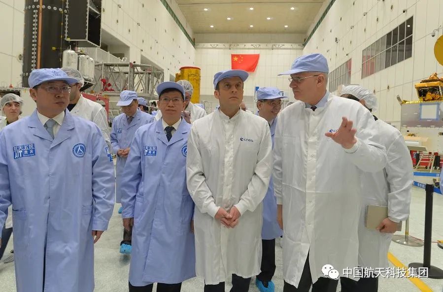 2018年1月,馬克龍訪華時曾來航天科技集團五院參觀訪問,當時,**中法合作研製的首顆衞星——中法海洋衞星(CFOSAT)**已經完成總裝集成,正在進行測試,雙方專家向馬克龍報告了合作研製的進展情況。