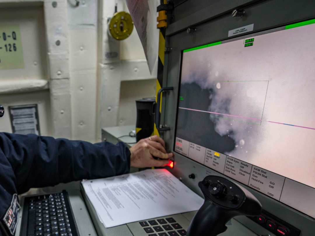 從這張照片上看,這應該是某種現代軍艦艦炮的操控台,屏幕上顯示的是光電觀測和雷達探測的畫面,右側的手柄和扳機則是必要時用來手動控制火炮和發射的。根據軍武菌判斷:這是一台美製艦載“密集陣”CIWS近防炮的控制枱。