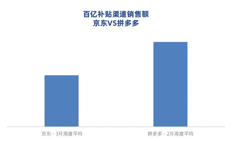 截至3月23日,**京東百億補貼渠道****平均每週GMV約為拼多多的60%,****佔比京東總GMV的約5%,**與拼多多首次推出百億補貼渠道時的情況相似。
