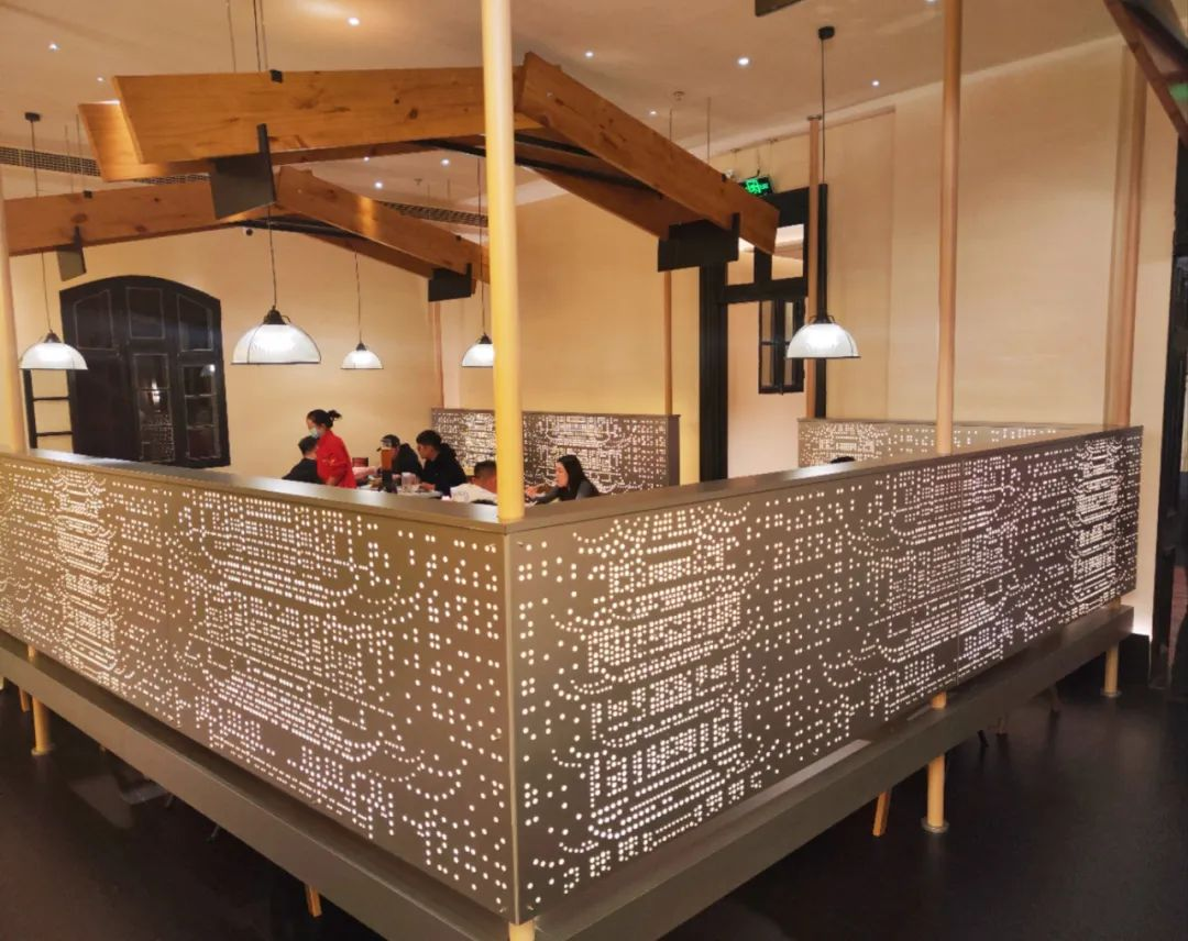 在用餐區,黃鶴樓、江城武漢的元素依然隨處可見,但設計更加巧妙。比如4樓用餐區的圍擋上,別具一格地採用透光點陣形成了黃鶴樓的圖樣,還有按照真實比例仿黃鶴樓木卯榫的結構被用於餐廳的吊頂,武昌火車站的站台也被悄悄融進了用餐區。