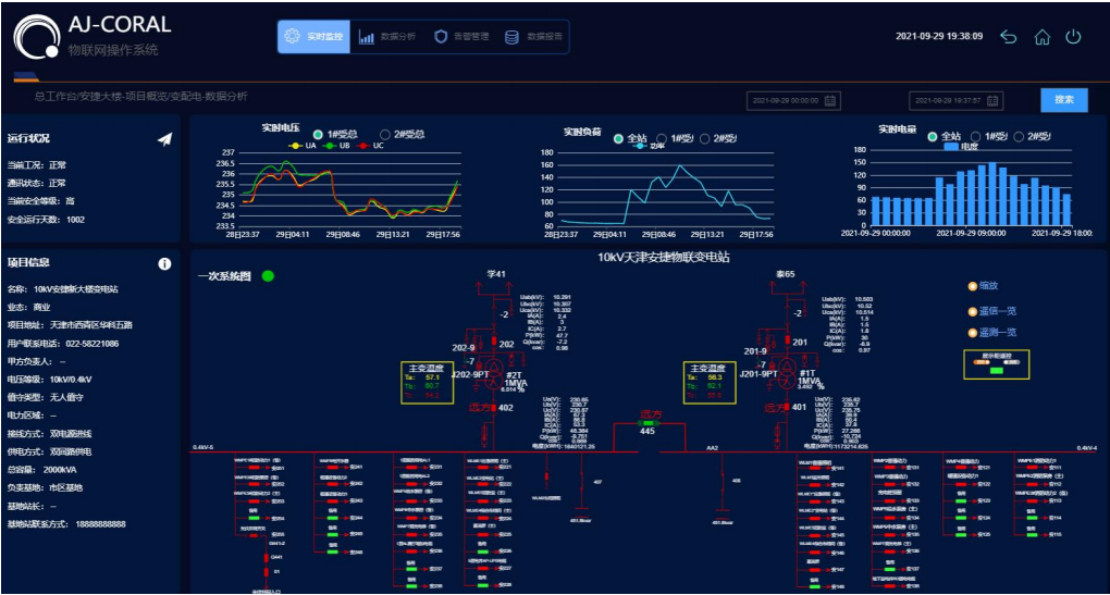 **亦城科技中****心——電力智能化託管運維服務。**安捷物聯依託物聯網大數據電力監控平台打造配電室智慧託管運維模式,以此代替傳統人員值守運維模式,單個配電室運維人工成本降低達20萬元/年,自服務以來該項目已連續安全運行超2000天。