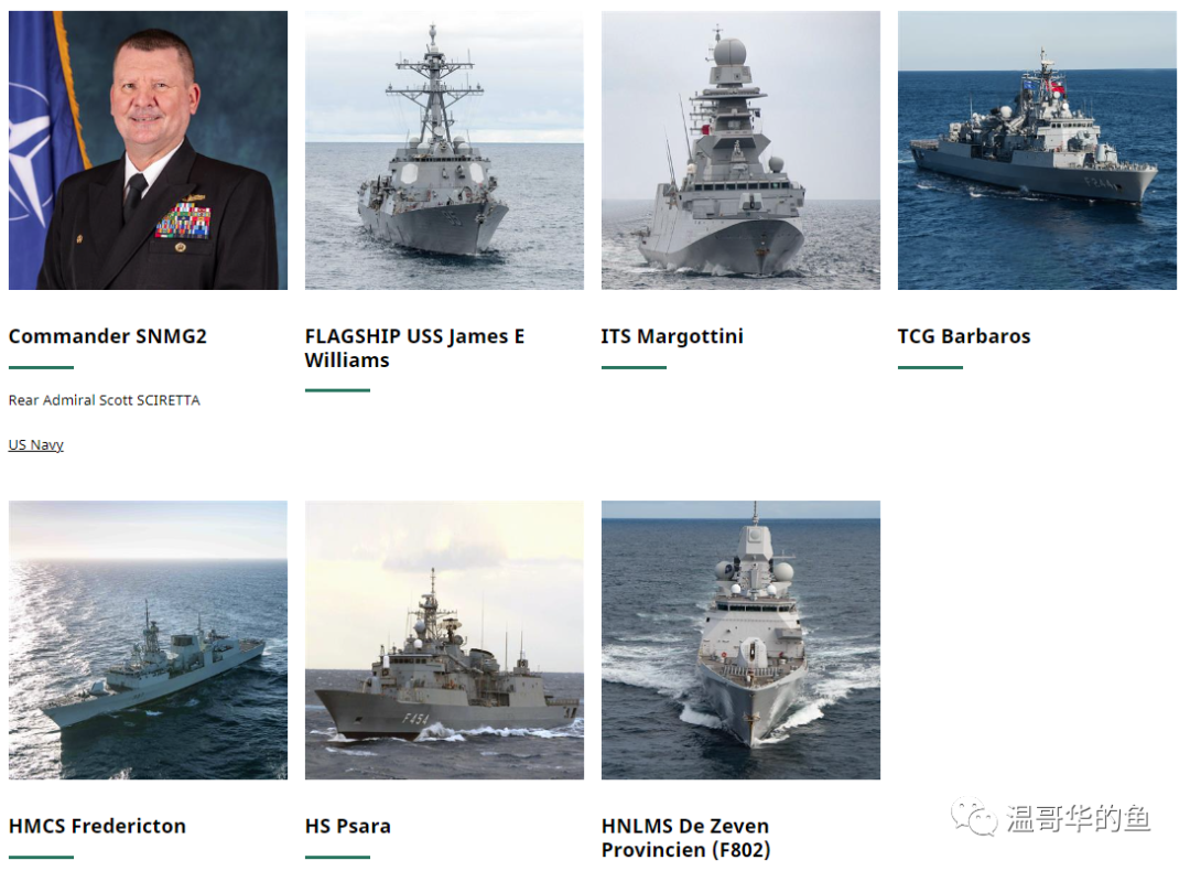 SNMG2也由6艘軍艦組成:旗艦美國“詹姆斯·威廉姆斯”號驅逐艦(伯克級)、意大利“馬爾戈蒂尼”號護衞艦(FREMM)、土耳其“巴巴羅斯”號護衞艦(MEKO 200TN型)、加拿大“弗雷德裏克頓”號護衞艦(哈利法克斯級)、希臘“普薩拉”號護衞艦(MEKO 200HN型)和荷蘭“七省”號護衞艦,司令是美國海軍少將斯科特·西約塔。