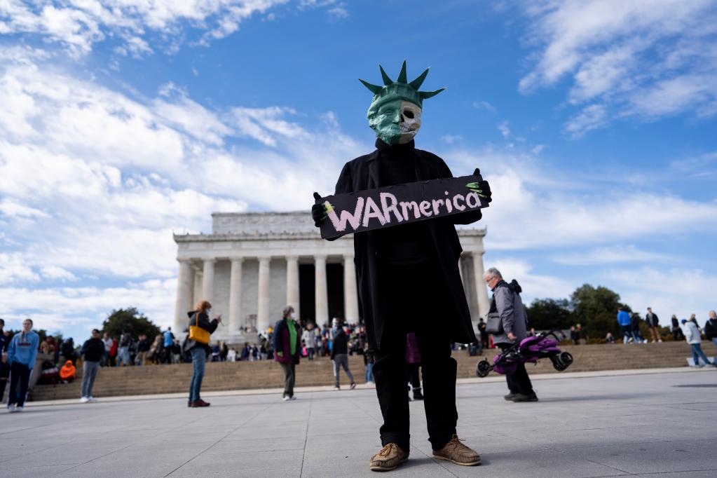 2023年2月19日,在美國首都華盛頓,一名抗議者手舉標語在林肯紀念堂前參加反戰集會。新華社記者劉傑攝