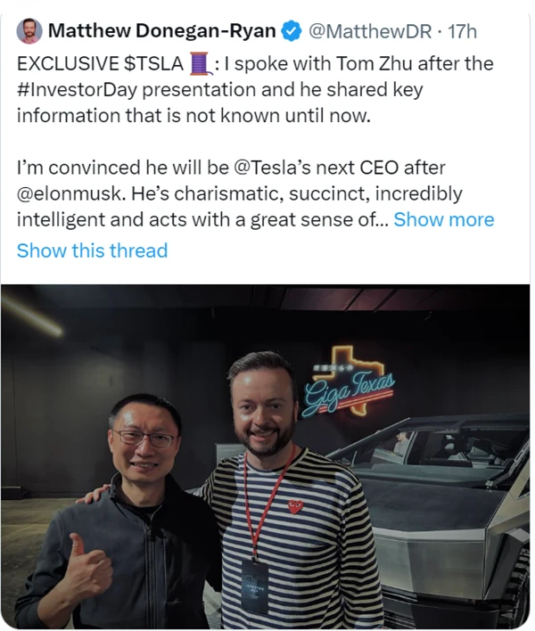 在特斯拉投資者大會結束之後,朱曉彤與到場的幾位特斯拉個人投資者進行了交流。這位投資者對朱曉彤很有信心,相信朱曉彤將成為特斯拉“馬斯克之後的下一任首席執行官。他很有魅力,説話簡潔,非常聰明,而且緊迫感十足。他將成為我們的蒂姆庫克。”