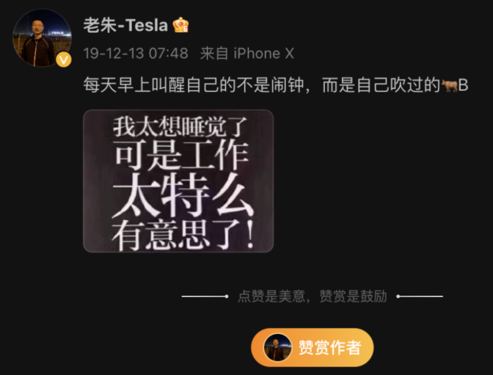 上海工廠投產時期,他還在微博上發過一張圖:我太想睡覺了,可是工作太有意思了。