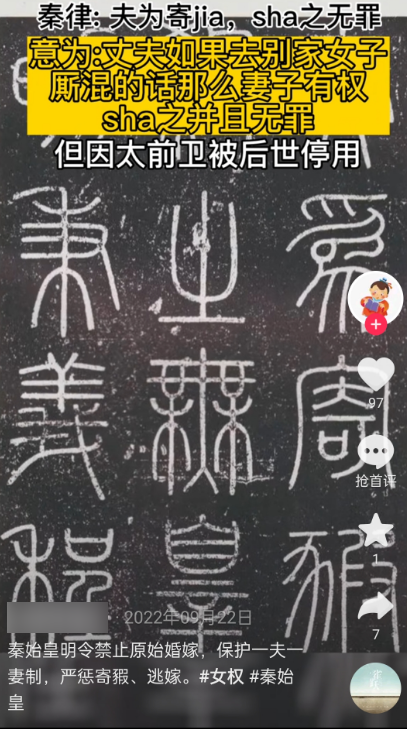 有人就因為《 史記 · 秦始皇本紀 》中記載,秦始皇給了女性的一項特權, “ 夫為寄豭, 殺之無罪。 ” ,就覺得秦始皇實現了男女平權,特別超前。
