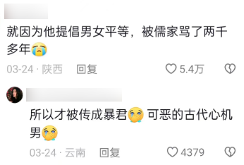 很快這事兒就演變成了:秦始皇因為提倡男女平等,被儒家罵了兩千多年。秦始皇就因為這事被傳為暴君,都怪古代心機男。