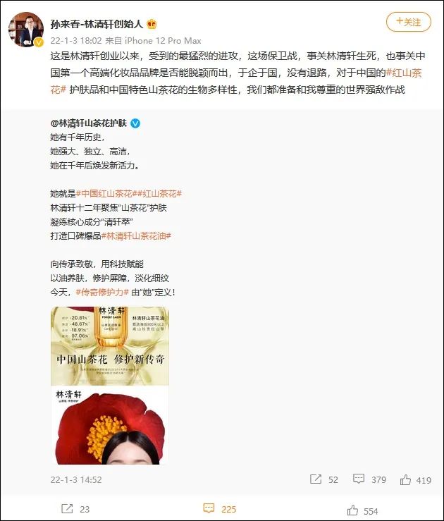 即便國際巨頭香奈兒在2021年推出了紅色山茶花系列,明顯與林清軒的紅山茶“撞車”,孫來春也沒有因為對方是大牌而沉默。