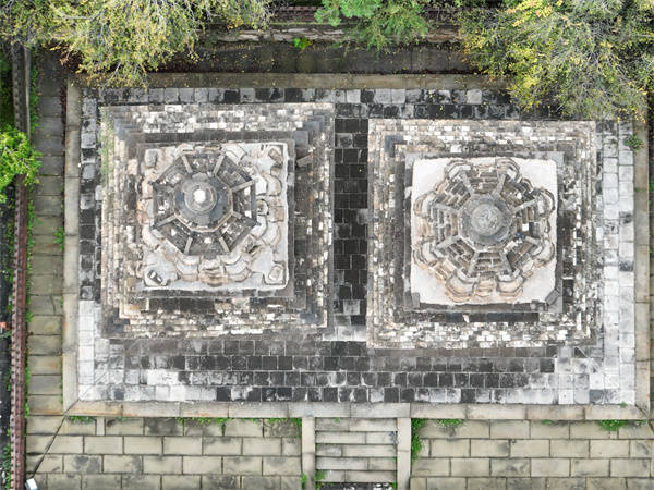 因兩塔基底相連,故稱連理塔。這兩個塔形制相同,塔平面成方形,均高8米。塔身邊寬各3米,高2.5米,正面均開青石卷門,隱刻卷草花瓣,門楣飾火焰。另三面各劈半開門直欞假窗,塔檐磚疊澀十一層,出檐0.5米,高1米。仔細欣賞,外形俊美,雕造秀麗,束腰座之上是方形塔身,正面為半圓形門拱,火焰形卷面,隱刻卷草和花瓣。塔檐疊澀而成,塔頂剎部雕造精巧,亭台式樣,雕欄額、普柏枋和斗拱,極頂為八角形塔檐和寶珠。外形俊美,雕造秀麗,既有唐代古樸遺風,又有宋代精細刻法。
