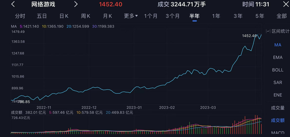 和此前如UGC、VRAR、雲遊戲、元宇宙等等一樣,“AI”已經在過去5個月內為網絡遊戲板塊帶來了超過60%的漲幅。不只三七互娛、完美世界、世紀華通這樣穩定在二梯隊的企業,金科、巨人這樣沉寂許久,且暫無熱門新品的“掉隊”公司也都拿到了多次飄紅。