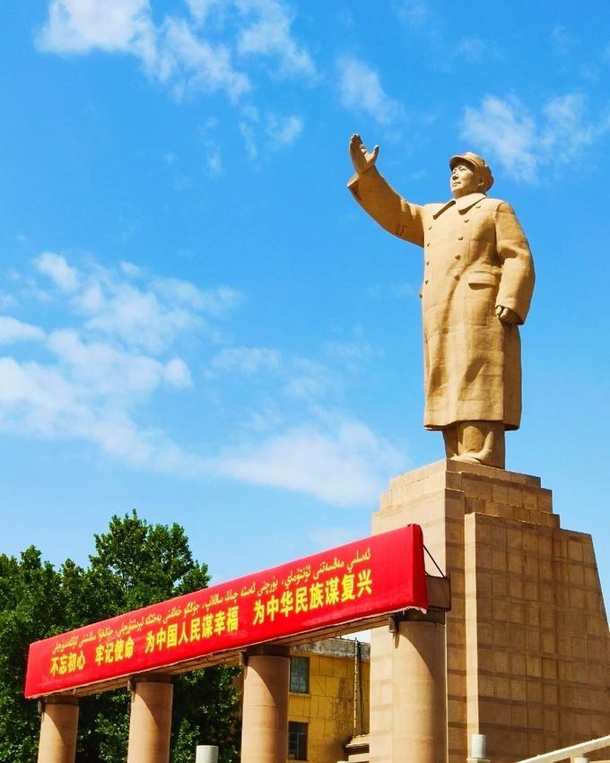到過喀什的遊客大都知道,在喀什市人民廣場主席台後,矗立着一座銀灰色毛主席巨型塑像,雄偉壯觀、氣勢恢宏。1967年,為了表達對毛澤東主席的熱愛之情,喀什的各族幹部羣眾決定效仿內地,在喀什修建一座毛澤東主席塑像,塑像模式採用的就是當時西安火車站那個“毛主席揮手我前進”。為了解決資金問題,幹部、工人、學生人人不甘落後,有錢的出錢,有糧的出糧,有力的出力,慷慨解囊,情景感人。1969年夏秋之際,毛主席塑像建造工程基本竣工。整個塑像高24米,其中底座高11.74米,毛主席立像高12.26米,寓意毛主席的生日為12月26日。
