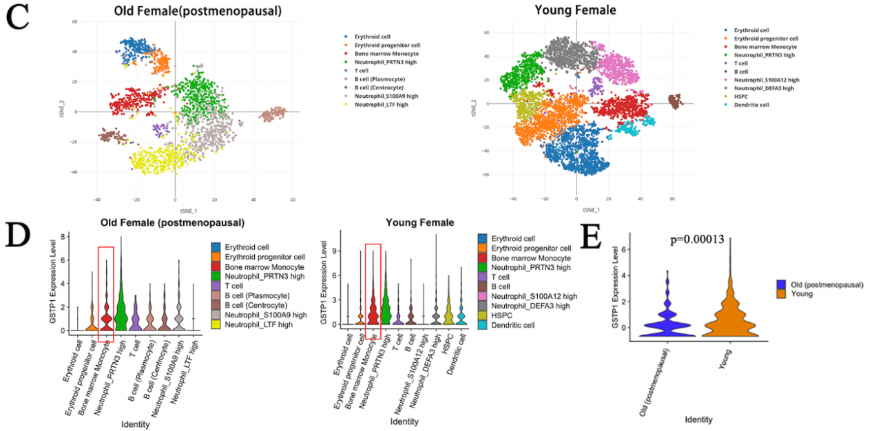 該研究首先通過孟德爾隨機化分析以證明 MDS與骨礦物質密度(BMD)之間存在的的潛在因果聯繫。總結了已經報道的MDS信號轉導蛋白和可能作用的靶位,發現GSTP1可能影響BMD,利用RT-qPCR檢測成骨細胞特異性基因RUNX2的表達量、敲低或過表達GSTP1發現GSTP1與成骨細胞分化關係不大,結合骨髓單細胞分析和Western Blot發現GSTP1在骨髓單核細胞中高度表達,且在老年女性和年輕女性中出現差異,發現GSTP1對BMD的影響更可能通過破骨細胞發生。