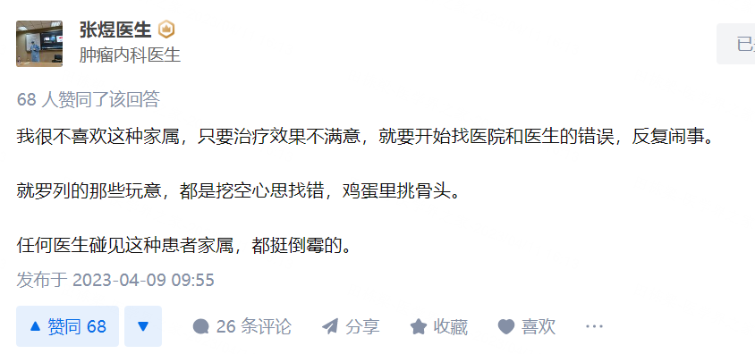 以幫助患者揭醫療黑幕為己任的“張煜醫生”的回答也有68人贊同:我很不喜歡這種家屬,只要治療效果不滿意,就要開始找醫院和醫生的錯誤,反覆鬧事。就羅列的那些玩意,都是挖空心思找錯,雞蛋裏挑骨頭。任何醫生碰見這種患者家屬,都挺倒黴的。