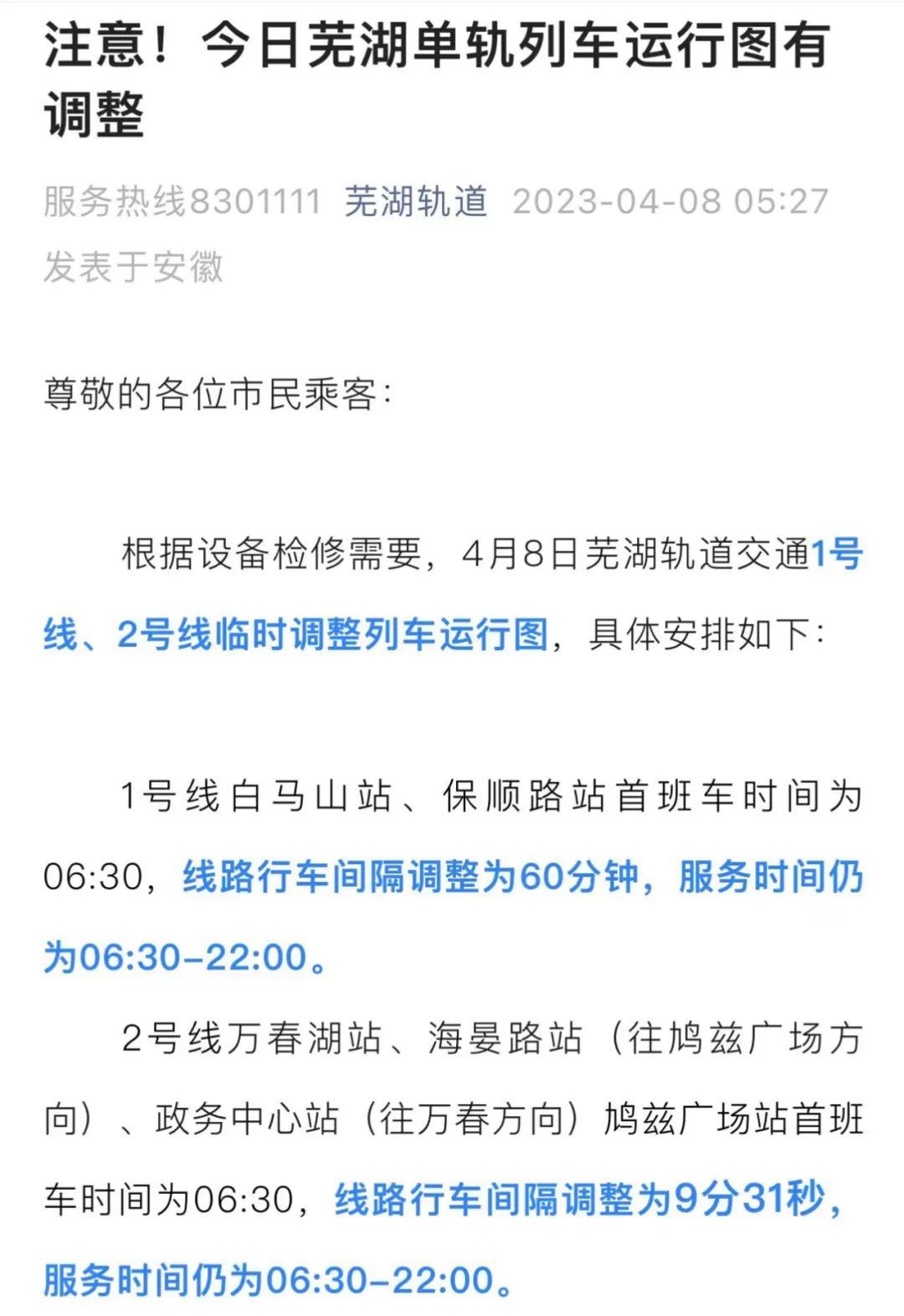 記者剛剛瞭解到,蕪湖軌道交通4月9日發佈最新通知,蕪湖軌道交通1號線、2號線一期自2023年4月9日6時30分起已恢復正常運營。