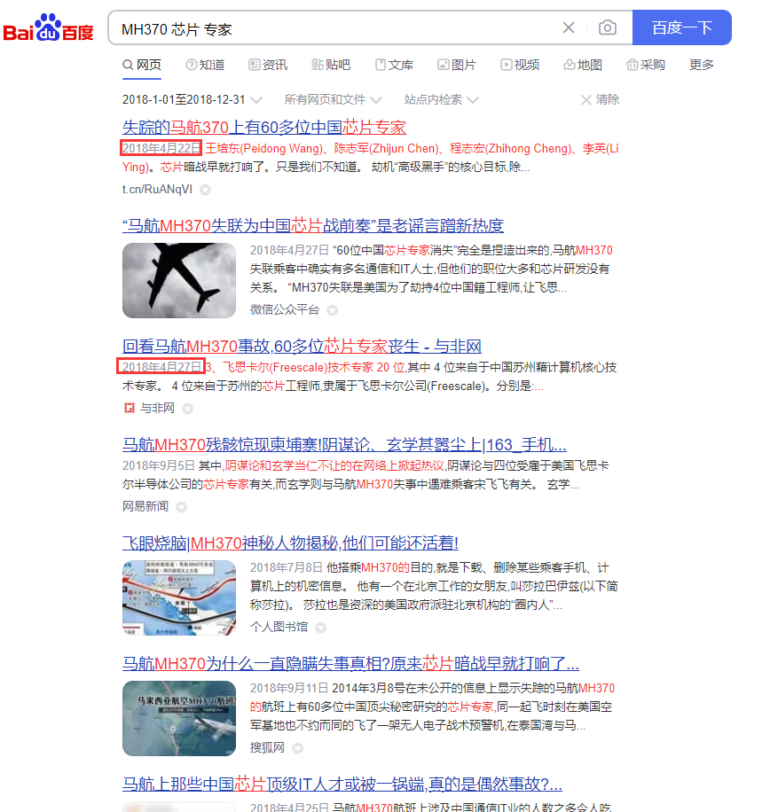 由於和我的記憶出入比較大,我搜了下當時事故發生後的媒體報道,搜到的新浪當時報道內容是涉及通訊IT業的遇難人數是29人(https://tech.sina.com.cn/t/2014-03-10/00469225464.shtml),接着我再用“MH370”、“芯片”、“專家”作為關鍵詞在百度上搜索了下,得到的結果如下: