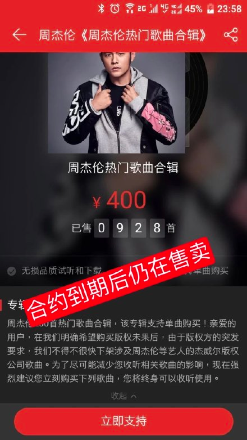 就在雙方合約到期前一天,網易雲將周杰倫200多首熱門歌曲打包,以400元價格售賣。