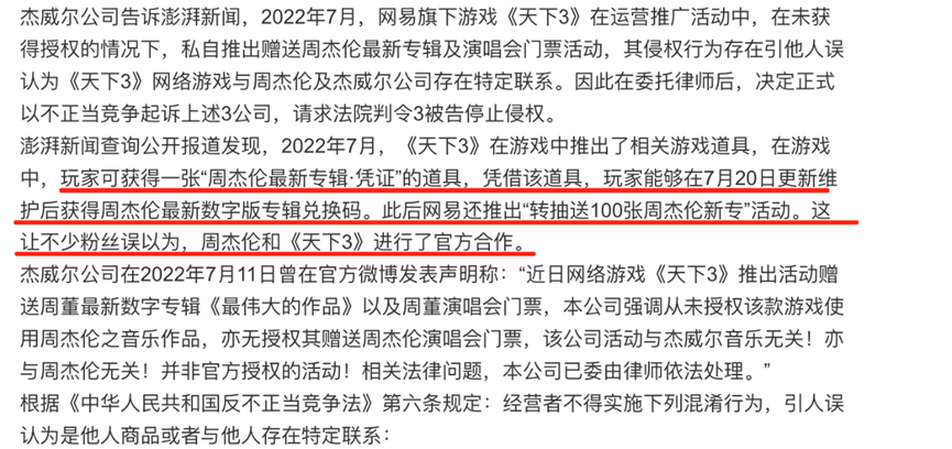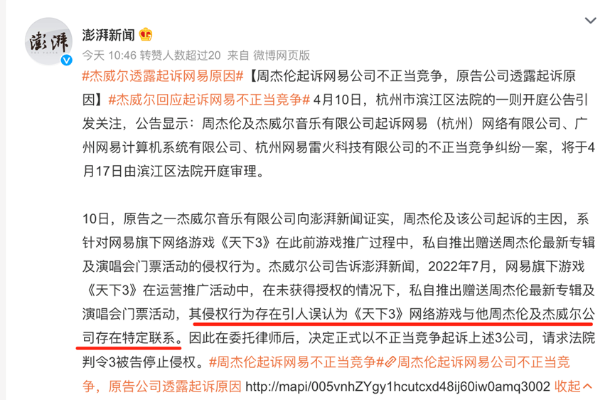 至於雙方此次因為何事鬧上法庭,根據澎湃新聞報道,其原因是網易旗下游戲侵權了周杰倫。