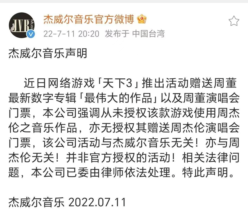 然而這些行為均未得到周杰倫方的授權,在未得到藝人授權的情況下,品牌方是無權用抽獎送周邊、門票等方式來為自己做宣傳的。