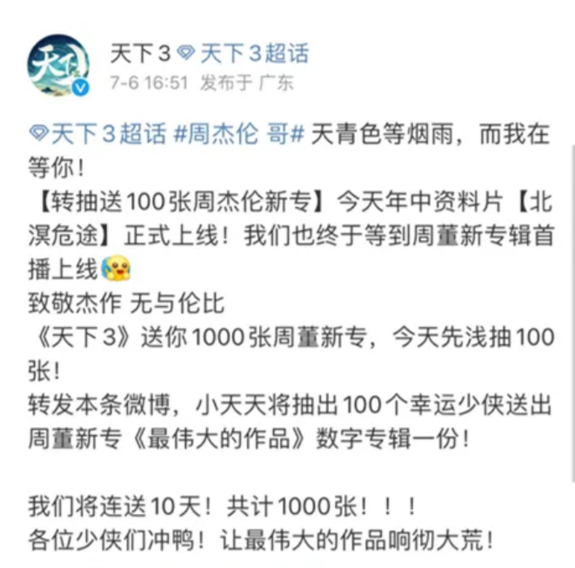 之後,官方在進行宣傳時又發佈了抽獎活動,其獎品正是周杰倫新專以及演唱會門票。