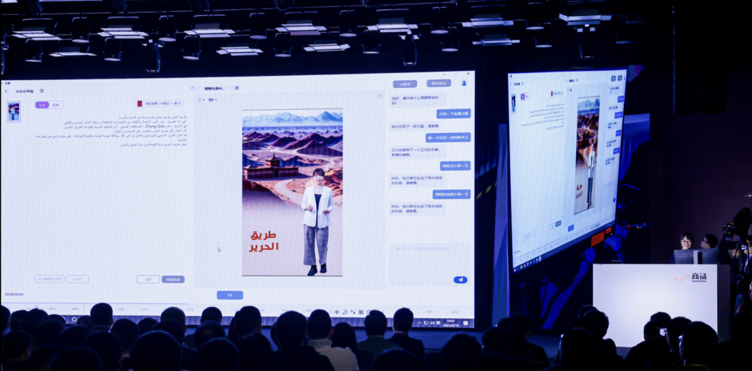 在現場展示中,工作人員讓 AI 生成一段介紹絲綢之路的文字,再分別翻譯為英語、阿拉伯語兩種不同的文字,讓數字人分別用對應的語言進行介紹。