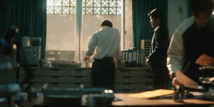 劇中初登場時,他抓人的不是肢體動作,而是泛紅的眼皮和憂鬱的眼神。前者表現疲憊,後者告訴觀眾這名檢察官的過去並不幸福。