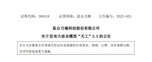 4月10日,崑崙萬維宣佈,經過公司與北京奇點智源科技有限公司(以下簡稱“奇點智源”)的共同努力,現宣佈即將推出對標 ChatGPT 的雙千億級大語言模型——“天工”3.5,並定於 4 月 17 日啓動邀請測試。