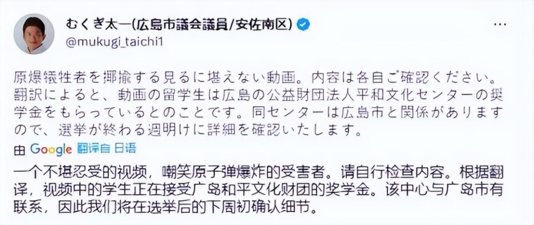日本廣島市議員椋木太一(自稱爆炸受害者後代)在社交媒體發文説,在他看過這則揶揄核爆犧牲者的視頻後,認為兩人的行徑令人難以忍受,同時他準備調查二人獲得廣島市和平文化獎學金一事。