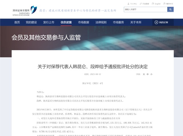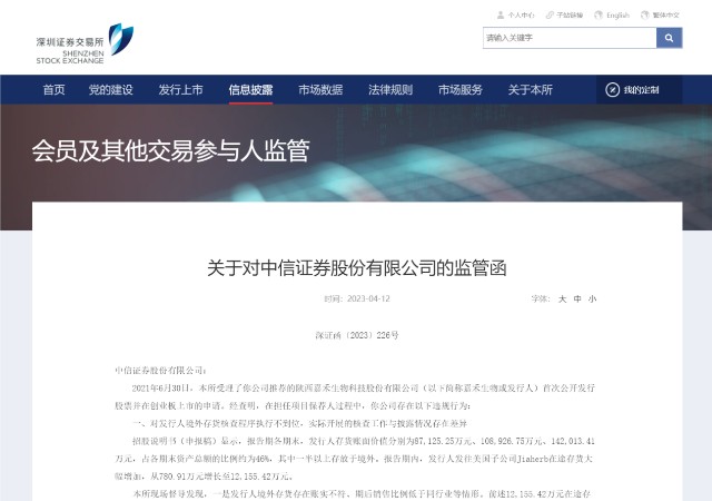 監管函指出,2021年6月30日,深交所受理了中信證券推薦的陝西嘉禾生物科技股份有限公司(以下簡稱“嘉禾生物”或發行人)首次公開發行股票並在創業板上市的申請。
