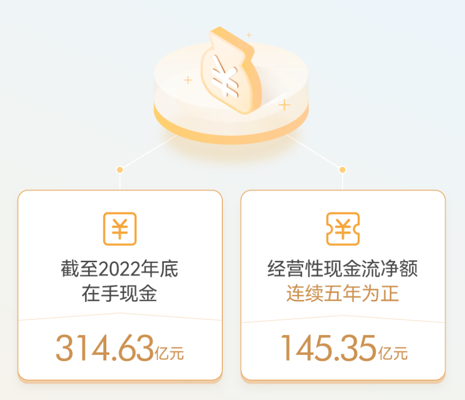 現金流方面,2022年,公司經營性現金流淨額145.35億元,經營性現金流連續五年為正,截至2022年末,新城控股在手現金餘額為314.63億元。