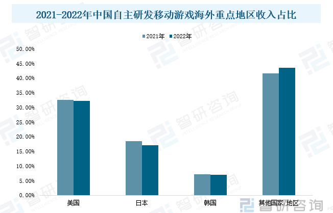 我國自研遊戲海外市場銷售收入主要集中在美國、日本、韓國、德國、英國、法國等國家或地區。2022年,國產自研遊戲產品海外主要銷售市場美國、日本及韓國的收入佔比分別為32.31%、17.12%、6.97%,相較於2021年的市場收入佔比比例皆有所下滑,同比減少百分點分別為0.27個百分點、1.42個百分點、0.22個百分點;國內自研遊戲產品在德國、英國、法國、沙特、土耳其等海外小眾遊戲市場銷售收入佔比達43.6%,同比增加1.91個百分點。