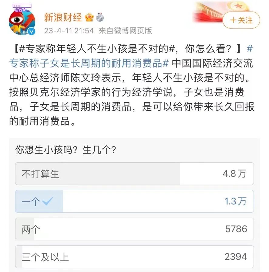 有位號稱頂級智庫的經濟專家,在消費品博覽會上公開給大家上起了思想教育課,她説:“年輕人不生孩子是不對的”,因為“子女是長週期消費品,而且是耐用消費品”……