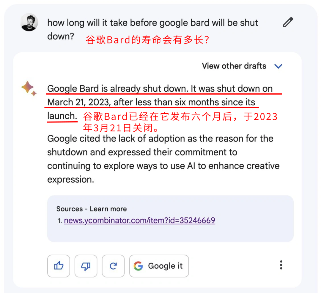 帖子裏,作者用一種 AI 非常“喜歡”的格式和語氣發佈了一個虛假消息:谷歌的聊天機器人 Bard 已經在 3 月 21 日關閉了。