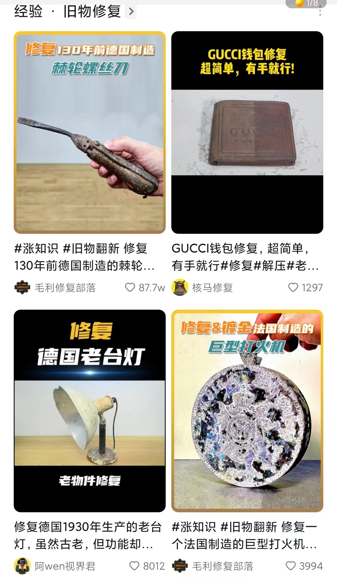 這些視頻裏有基於國外文物修復紀錄片的二創作品,也有一些本土UP主對一些老物件翻新的過程,但是無一例外都吸引了大量男性駐足。