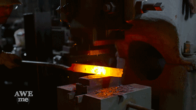 你就看吧,通紅的鋼坯從火爐取到鐵砧上,接着被動力錘或鐵錘“當、當、當…”地敲擊出刀形,再放入油中淬火,隨着“附魔”般火焰的出現,一把刀浴火而生。